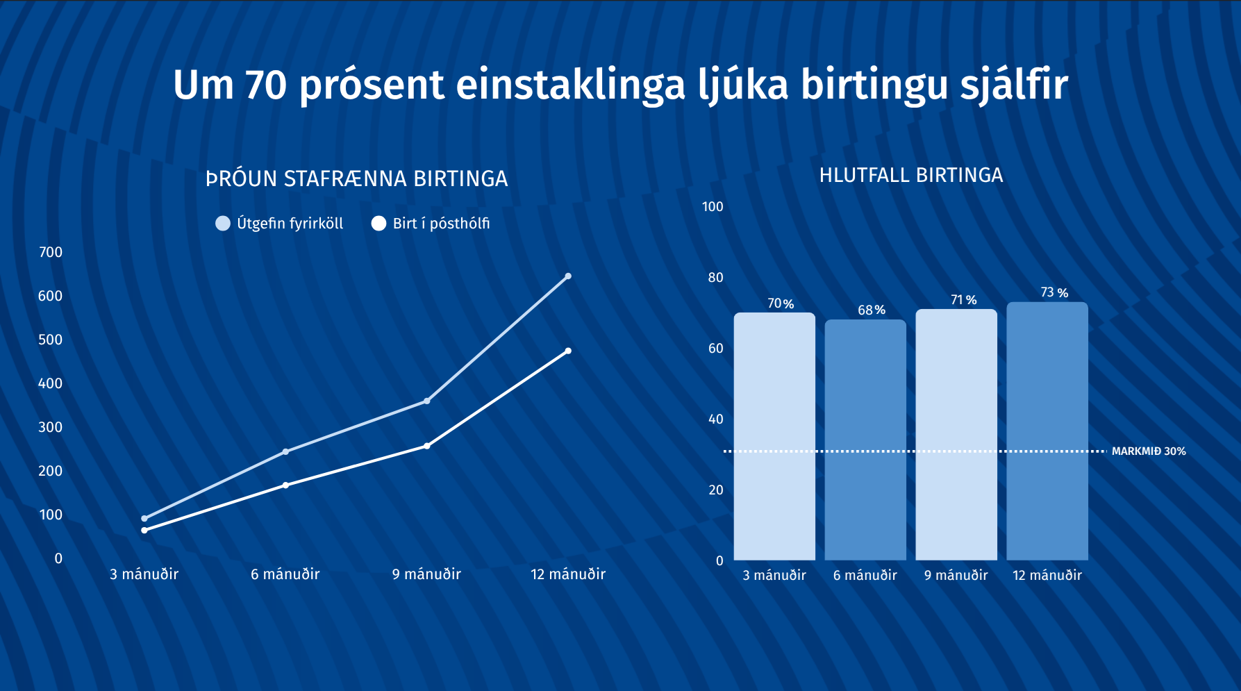 Í upphafi var gert ráð fyrir að um 30 prósent þeirra sem fengju stafræna birtingu myndu ljúka henni sjálfir í gegnum pósthólfið en niðurstöðurnar hafa farið langt fram úr væntingum. Um 70 prósent einstaklinga ljúka nú birtingu sjálfir á Ísland.is.
